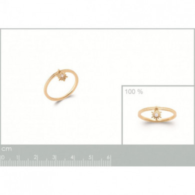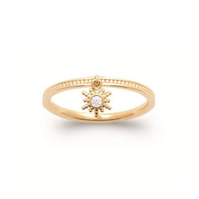 Bague plaqué or soleil orné d'une pampille oxyde de zirconium. Largeur maxi : 2 mm. Cette bague existe en différents tours de doigt. Cette bague femme est un bijou en plaqué or de qualité finition perlée, avec petit soleil orné d'un oxyde de zirconium. Garantie 2 ans. Marque française.