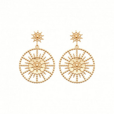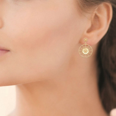 Illuminez votre visage avec ces longues boucles d'oreilles en plaqué or représentant un soleil ajouré finement perlé