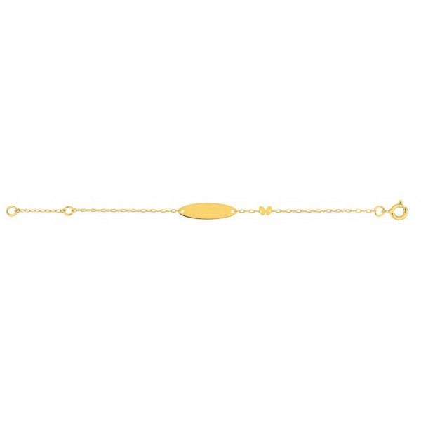 Gourmette identité bébé en or jaune, plaque ovale -Dim. : 20 x 6 mm sur maille forçat ornée d'un petit papillon sur un côté -Fermoir anneau ressort -Longueur totale ajustable à 12 ou 14 cm.