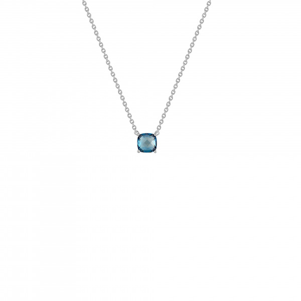 Collier or blanc JOELLI Topaze blue London traitée coussin faceté (dim. : 6 x 6 mm) serti 4 griffes sur chaîne maille forçat. Longueur : 42 cm avec anneau intermédiaire à 40 cm. Fermoir mousqueton. Ce collier est un bijou femme en or 750 millièmes (ou 18 carats), norme française. Garantie 2 ans. Livré avec un certificat d'authenticité. S'agissant de pierres naturelles, leur aspect et leur couleur peut varier selon les modèles.