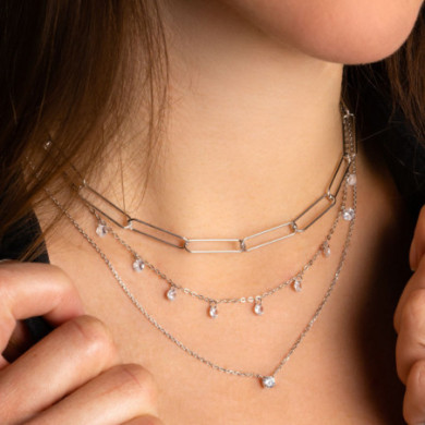 Collier argent rhodié ras de cou. Largeur maxi : 4 mm. Fermoir mousqueton. Longueur totale du collier ajustable à 40, 42 ou 45 cm. Ce collier femme est un bijou en argent 925 millièmes de qualité avec oxydes de zirconium. Garantie 2 ans. Marque française.
