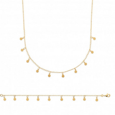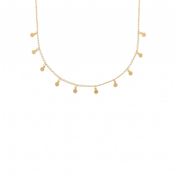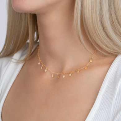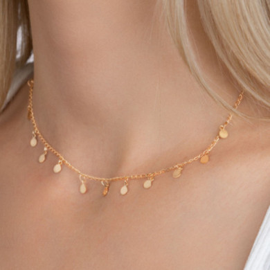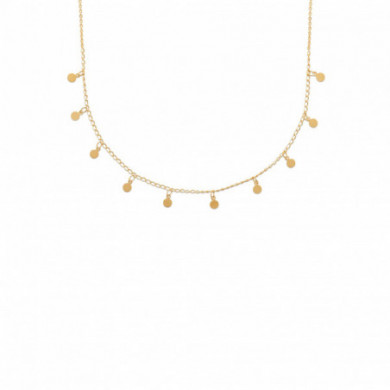 Collier plaqué or ras de cou avec pampilles rondes. Largeur maxi : 9 mm. Fermoir mousqueton. Longueur totale du collier ajustable à 38, 40 ou 42 cm. Ce collier femme est un bijou en plaqué or 18 carats de qualité. Garantie 2 ans. Marque française.