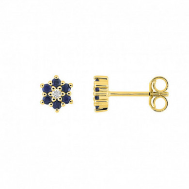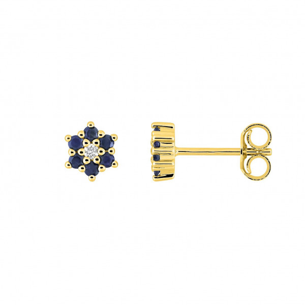 Ces boucles d'oreilles en or jaune 18 carats captivent par leur délicat motif floral. Au cœur de chaque fleur, un diamant scintillant illumine un éclat précieux, entouré de six saphirs profonds qui subliment son intensité. Un bijou raffiné et intemporel, parfait pour apporter une touche de couleur et d'élégance à chaque instant.