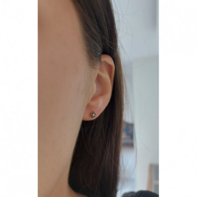 Boucles d'oreilles, style puces, en or jaune 750 millièmes (ou 18 carats) fleur diamant au centre, entourage de 6 rubis serti griffes, Diam. du motif : 4,75 mm. Système belge (tige + poussette). Garantie : 2 ans. L'aspect et la couleur des pierres naturelles peuvent varier. Livré avec un certificat d'authenticité.