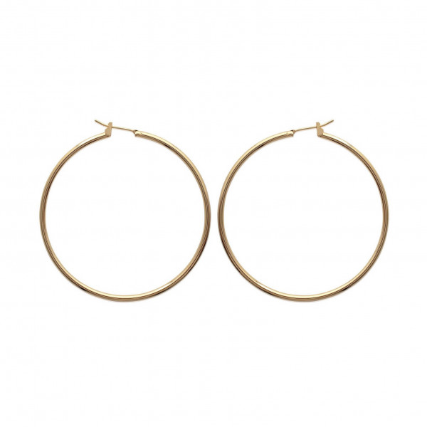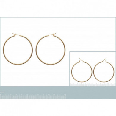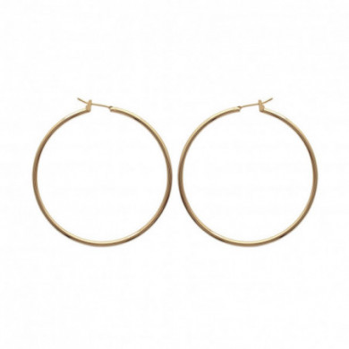 Créoles plaqué or. Diam. : 50 mm. Epaisseur : 2 mm. Système tige à clipser dans un U.