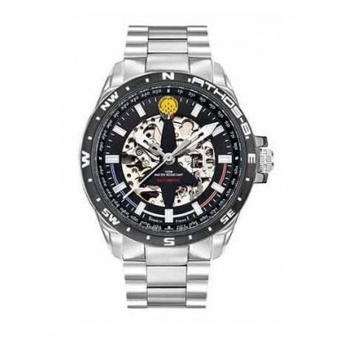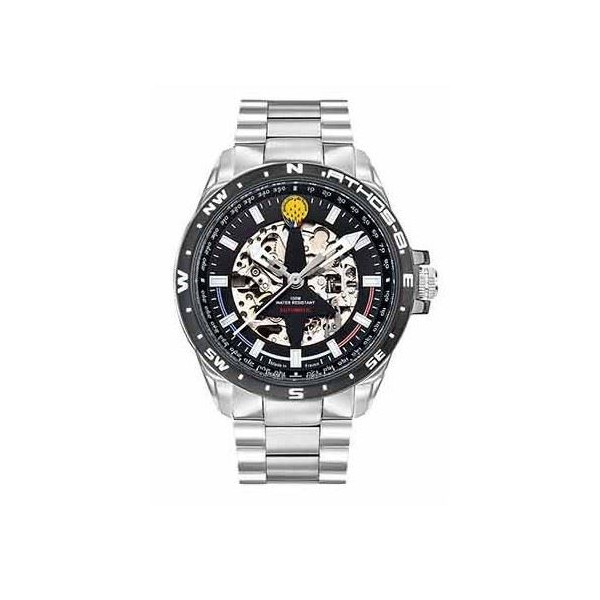 Montre automatique homme. Boitier : rond. Diam. : 44 mm. Cadran (fond) : noir. Affichage de l'heure : aiguilles argentées. Index : oui. Trotteuse : oui. Dateur : non. Etanchéité : 10ATM. Montre automatique. Bracelet en acier poli et brossé. Largeur : 22 mm. Cette montre est une montre en acier inoxydable de qualité, norme française. Marque française. Garantie du mouvement : 2 ans.